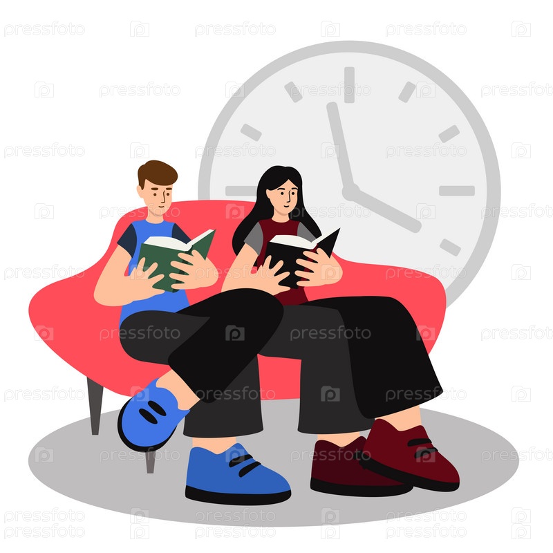 Люди читают книги, сидя на диване в библиотеке, время тикает векторная иллюстрация