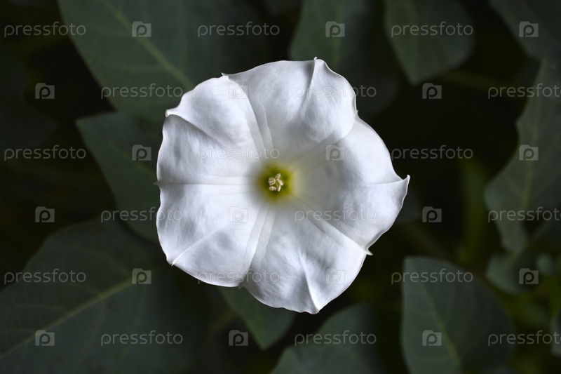 Большой белый цветок дурмана с зелеными листьями. Большие белые цветы
