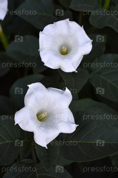 Большой белый цветок дурмана с зелеными листьями. Большие белые цветы