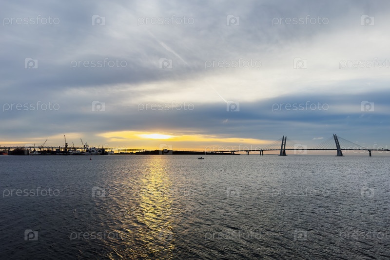 Вид на Финский залив вечером на закате, свет закатного солнца отражается в воде - Санкт-Петербург, Россия, Ноябрь 2023