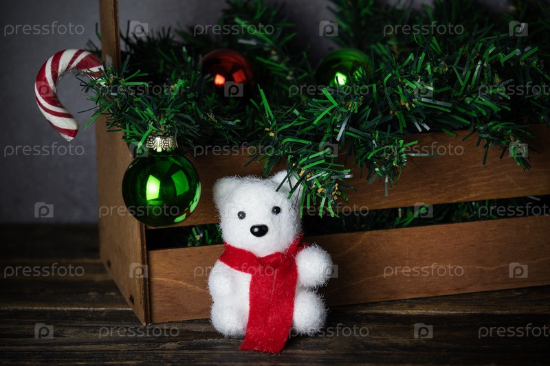 Новогодний натюрморт - белый игрушечный медведь в красном шарфе на фоне деревянной коробки с искусственными еловыми ветками