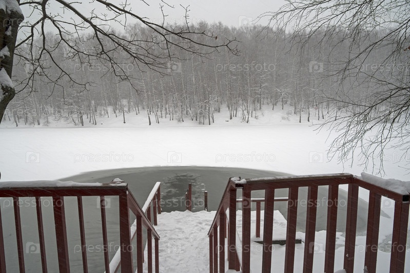 Прорубь для зимнего купания на небольшом пруду во время сильного снегопада.Теплостановский лесопарк, Москва, Россия. Пасмурный день в начале декабря