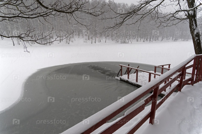 Прорубь для зимнего купания на небольшом пруду во время сильного снегопада.Теплостановский лесопарк, Москва, Россия. Пасмурный день в начале декабря