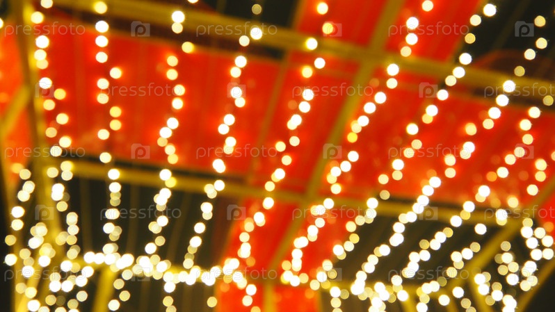 Боке в рождественскую ночь. Красивое округлое боке. Красный, желтый, золотой, белый цвета в темноте. Праздничный фон для Нового года с Рождеством. Размытая расфокусировка. Украшение городских улиц