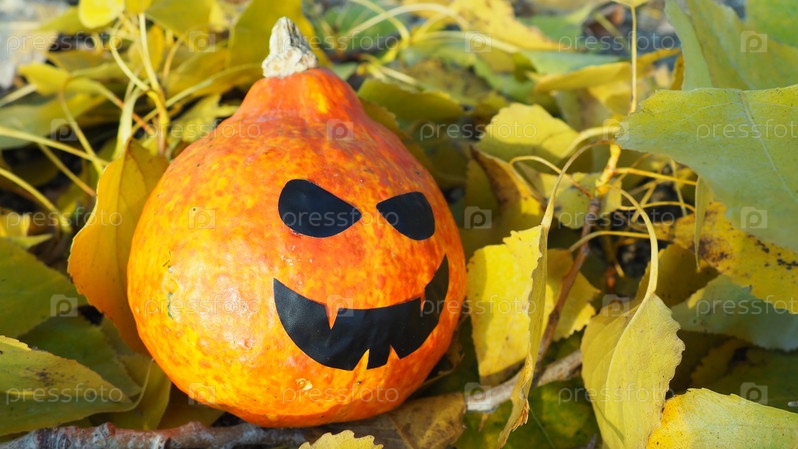 Хэллоуинская тыква с черным ртом и наклейками на глаза. Оранжевая овощная тыква лежит на осенних желтых листьях тополя. Тема Хэллоуина или Хэллоуина, канун всех святых или канун всех святых
