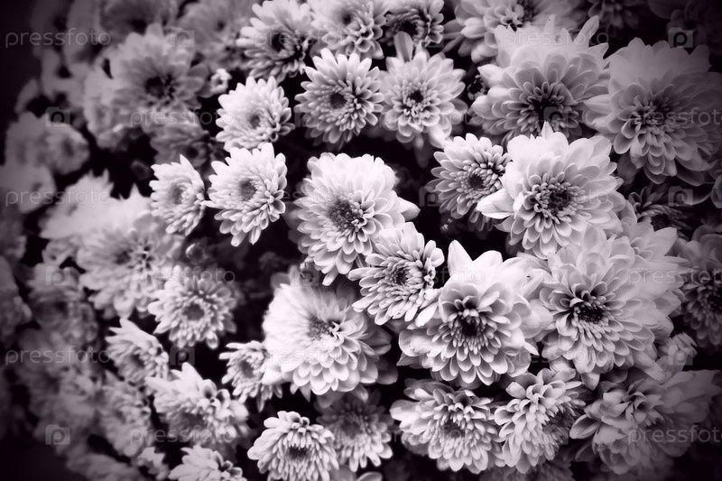 Хризантемы в букете. Черно-белая монохромная фотография. Темное виньетирование. Открытка или открытка. Поздравления или выражения сожаления. Цветочная текстура. Темная виньетка сиреневого оттенка или фильтра