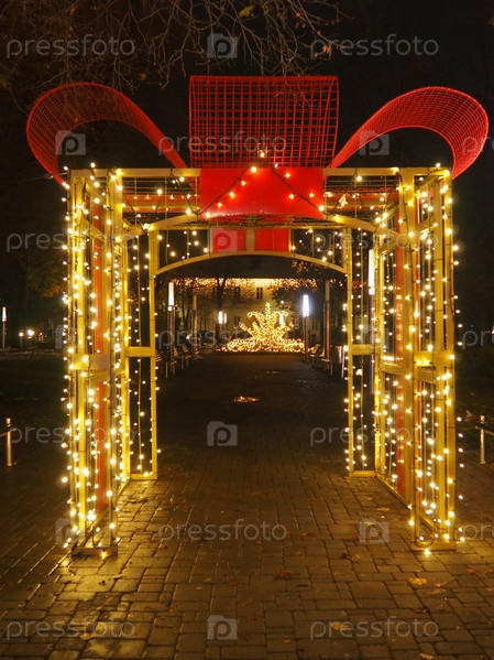 Арка с бантом. Красивые гирлянды украшают центр города. Уличные украшения к Новому году и Рождеству. Светящиеся многочисленные желтые и белые лампочки в темноте. Сремска Митровица Сербия