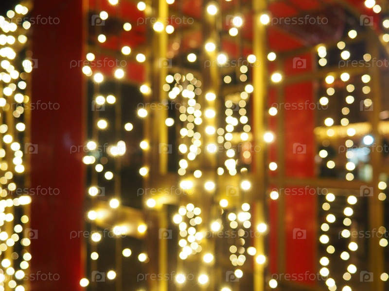 Боке в рождественскую ночь. Красивое округлое боке. Красный, желтый, золотой, белый цвета в темноте. Праздничный фон для Нового года с Рождеством. Размытая расфокусировка. Украшение городских улиц