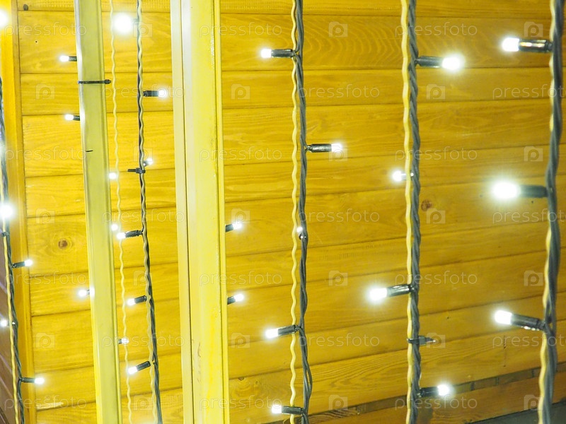 Декоративные гирлянды в рождественскую ночь. Красивое округлое боке. Белые вспышки на желтом фоне. Праздничный фон для Нового года и Рождества
