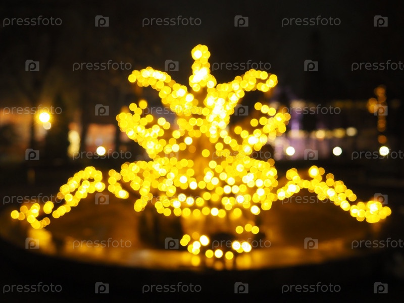 Боке в рождественскую ночь. Красивое округлое боке. Золотисто-желтый цвет мигает в темноте. Праздничный фон для Нового года с Рождеством. Размытая расфокусировка. Украшение городских улиц