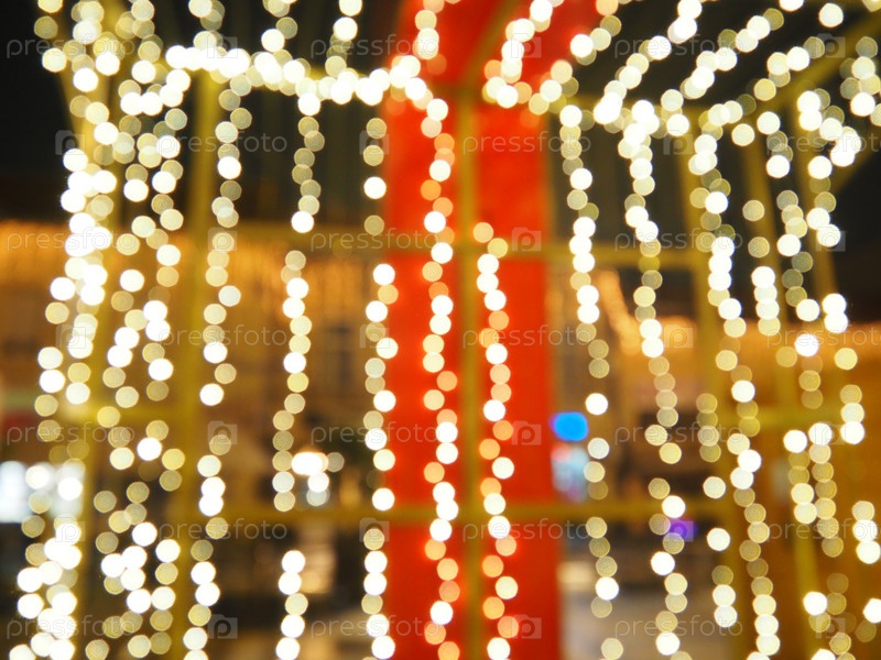 Боке в рождественскую ночь. Красивое округлое боке. Красный, желтый, золотой, белый цвета в темноте. Праздничный фон для Нового года с Рождеством. Размытая расфокусировка. Украшение городских улиц