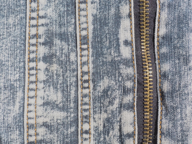 Джинсовая ткань крупным планом со швами и замками. Сильно потертые джинсы. Металлический замок бронзового желтого цвета с бегунком. Вертикальные швы