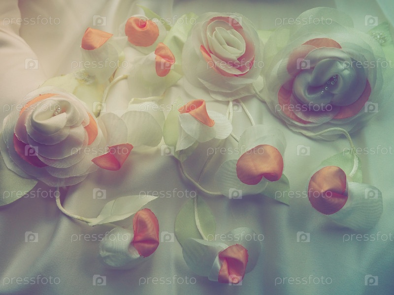 Свадебные цветы из ткани для украшения свадебного платья невесты. Винтажный стиль, размытое туманное изображение. Несколько искусственных цветов и бутонов из шелка. Свадебные украшения для церемонии