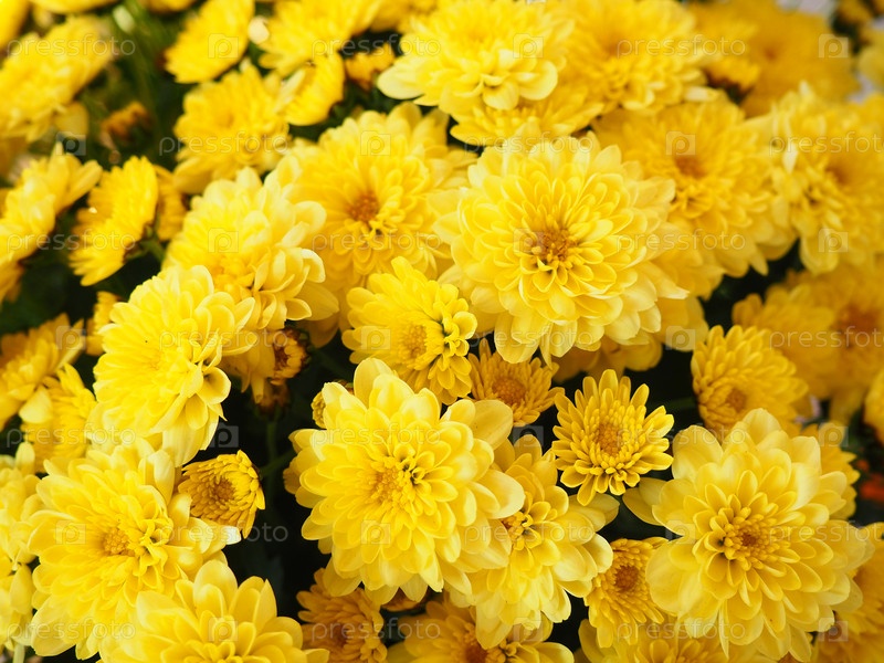 Хризантемы желтого цвета в букете. Цветочная текстура крупным планом. Открытка на свадьбу или день рождения. Осенние цветы семейства Астровые или Дендрантемы. Горизонтальное фото
