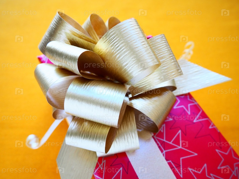 Красно-розовая подарочная коробка с большим золотым бантом на фоне цвета желтой охры. Подарок на Рождество, Новый год, День рождения, День матери, Свадьбу, День святого Валентина. Красивое праздничное украшение. Дарить подарки