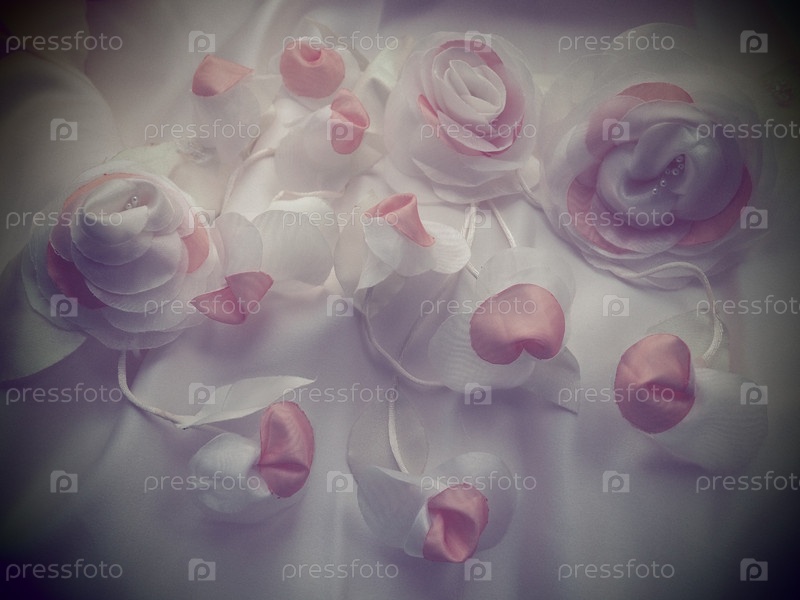 Свадебные цветы из ткани для украшения свадебного платья невесты. Винтажный стиль, размытое туманное изображение. Несколько искусственных цветов и бутонов из шелка. Свадебные украшения для церемонии