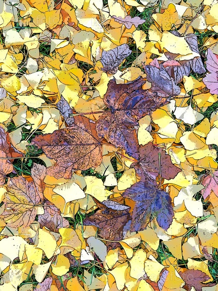 Листья гинкго билоба и кленовые листья лежат на земле. Желтая, коричневая и бордовая листва. Гинкго и клен. Осень в городском парке или лесу. Красочный фон на тему бабьего лета
