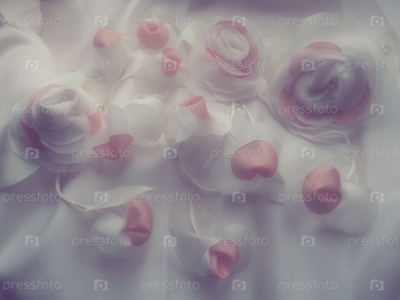 Свадебные цветы из ткани для украшения свадебного платья невесты. Винтажный стиль, размытое туманное изображение. Несколько искусственных цветов и бутонов из шелка. Свадебные украшения для церемонии