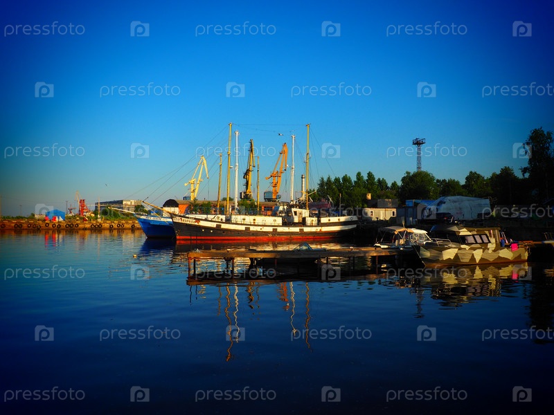 Петрозаводск, Россия, 10 июля 2021 года. Порт с грузовыми кранами и кораблями. Прогулочные деревянные яхты и катера. Промышленные здания. Онежское озеро, Карелия. Морская, транспортная и туристическая тематика. Вечер