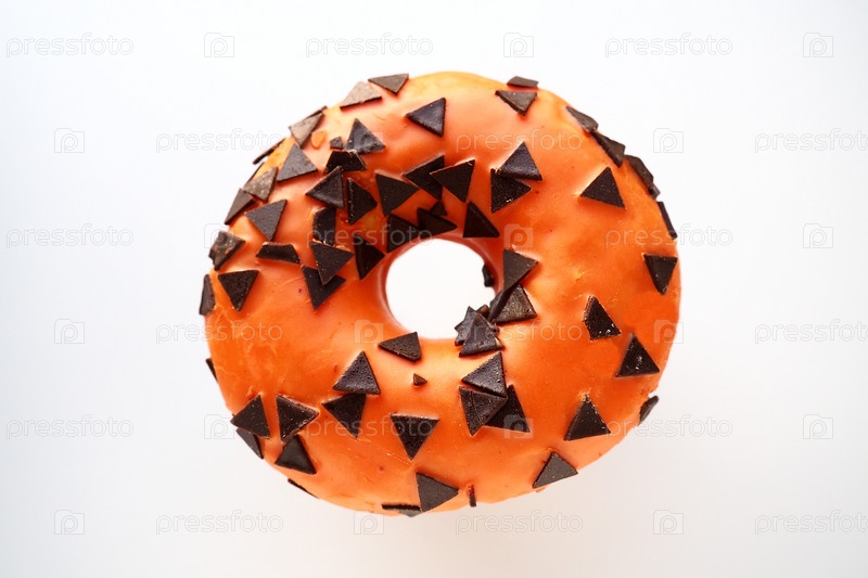 Пончик на Хэллоуин с апельсиновой глазурью и шоколадными треугольниками в качестве сладкой декоративной начинки. Детские праздничные сладости на белом фоне. Кошелек или жизнь. Канун всех святых. Пончик в канун Дня всех святых