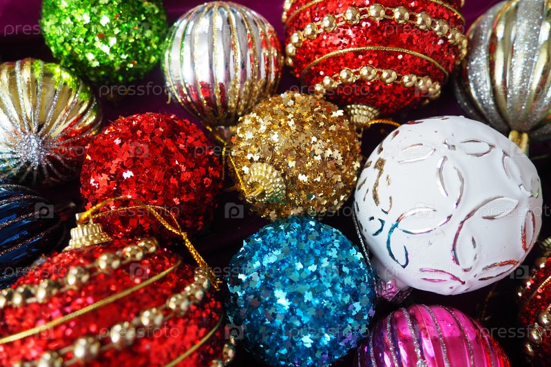 Разноцветные стеклянные блестящие шарики. Новогоднее рождественское украшение. Праздничный дизайн. Красные, синие, золотые, белые, зеленые полосатые шары. Фон в канун Рождества и Нового года. Крупным планом рождественские украшения