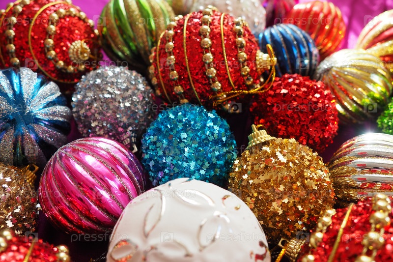 Разноцветные стеклянные блестящие шарики. Новогоднее рождественское украшение. Праздничный дизайн. Красные, синие, золотые, белые, зеленые полосатые шары. Фон в канун Рождества и Нового года. Крупным планом рождественские украшения