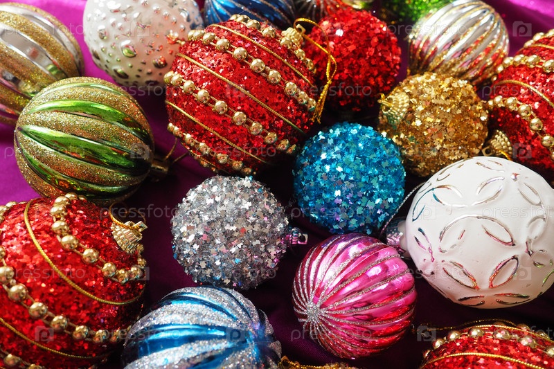 Разноцветные стеклянные блестящие шарики. Новогоднее рождественское украшение. Праздничный дизайн. Красные, синие, золотые, белые, зеленые полосатые шары. Фон в канун Рождества и Нового года. Крупным планом рождественские украшения