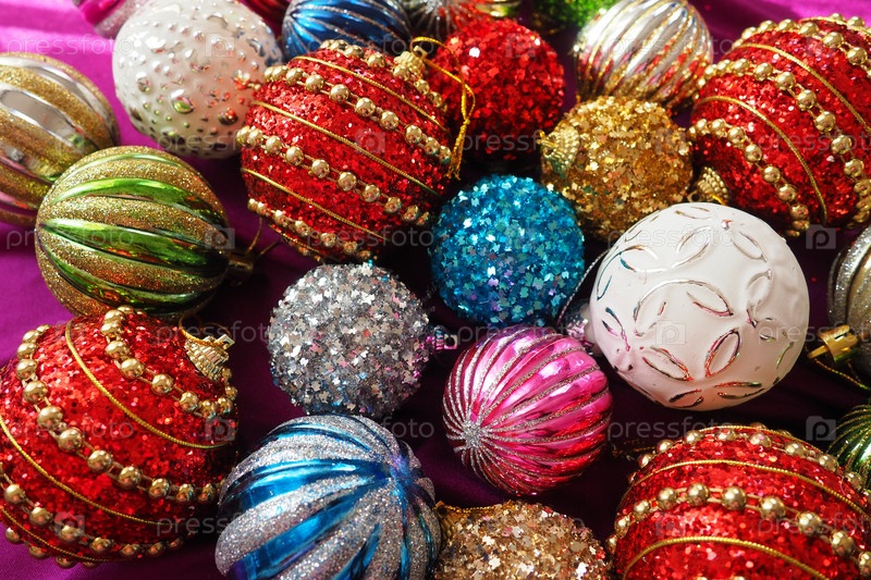 Разноцветные стеклянные блестящие шарики. Новогоднее рождественское украшение. Праздничный дизайн. Красные, синие, золотые, белые, зеленые полосатые шары. Фон в канун Рождества и Нового года. Крупным планом рождественские украшения