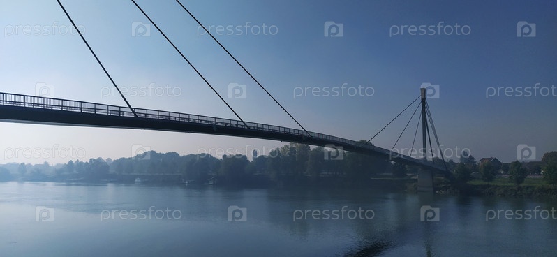 Сремска-Митровица, Сербия, 1 ноября 2021 года. Пешеходный мост через реку Сава. Люди переходят бетонный мост из Махван-Митровицы в центр города. Туманная погода и влажное утро