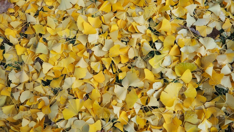 Листья билоба гинкго билоба лежат на земле. Желтая листва. Гинкго — род листопадных голосеменных растений, реликтовых растений класса Гинкго. Осень в городском парке или лесу. Естественный фон