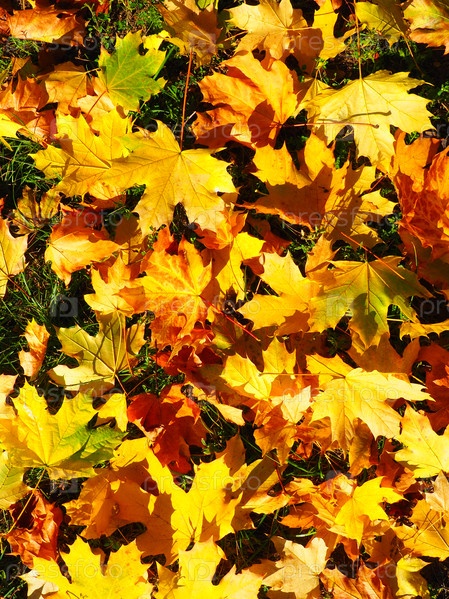 Кленовые листья фон. Бабье лето – период не по сезону теплой и сухой погоды. Много красивых красочных опавших листьев клена лежат на траве. Желтая, красная, оранжевая, зеленая текстура листьев