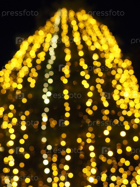 Боке подчеркивает. Золотисто-желтый цвет мигает в темноте. Праздничный фон. Размытая расфокусировка. Украшение городских улиц. Много желтых шариков. Много желтых, белых и оранжевых кругов