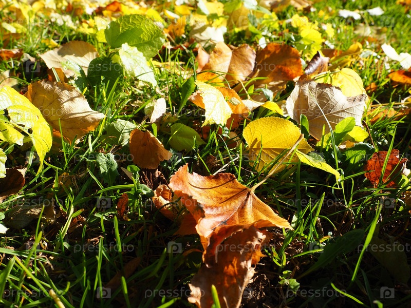 Желтые листья липы на траве. Городской парк. Опавшие листья европейской липы. Молодые растения пробиваются сквозь траву. Газон в листопаде. Солнечная тихая октябрьская погода. Бабье лето