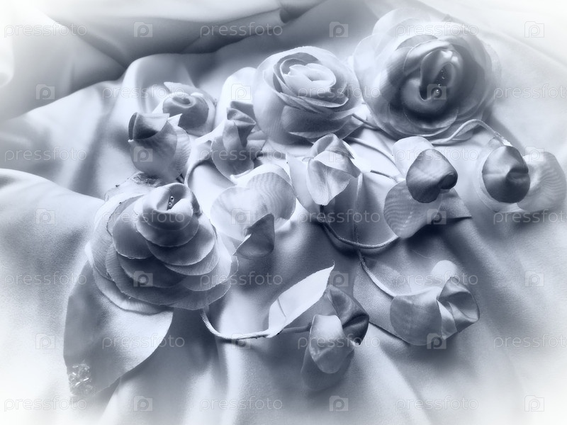 Свадебные цветы из ткани для украшения свадебного платья невесты. Винтажный стиль, размытое туманное изображение. Несколько искусственных цветов и бутонов из шелка. Свадебные украшения для церемонии