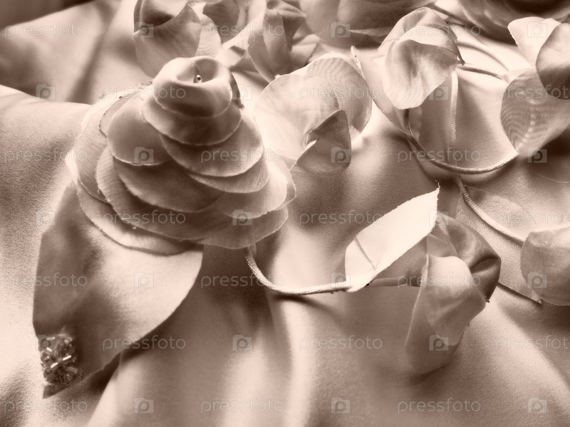 Свадебные цветы из ткани для украшения свадебного платья невесты. Винтажный стиль, размытое туманное изображение. Несколько искусственных цветов и бутонов из шелка. Свадебные украшения для церемонии