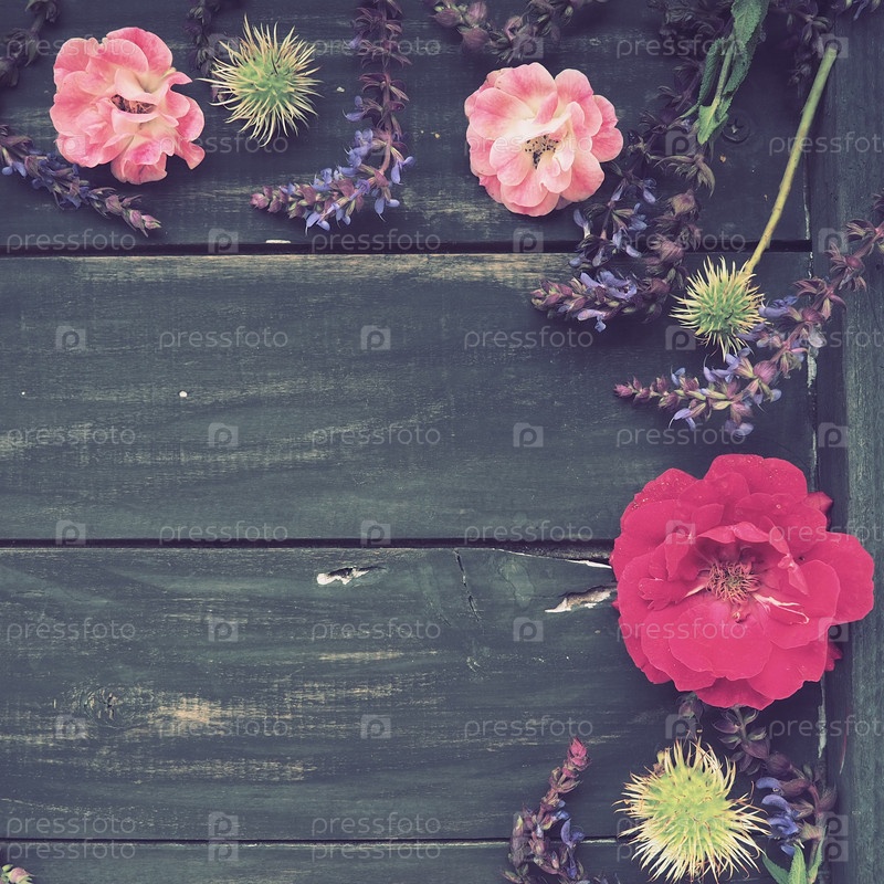 Цветы полукругом на деревянном фоне. Открытка к празднику. Розы, лаванда, шалфей и волосатые каштаны по краям на темных досках. Пространство для копирования фона, плоская планировка. Праздничный плакат