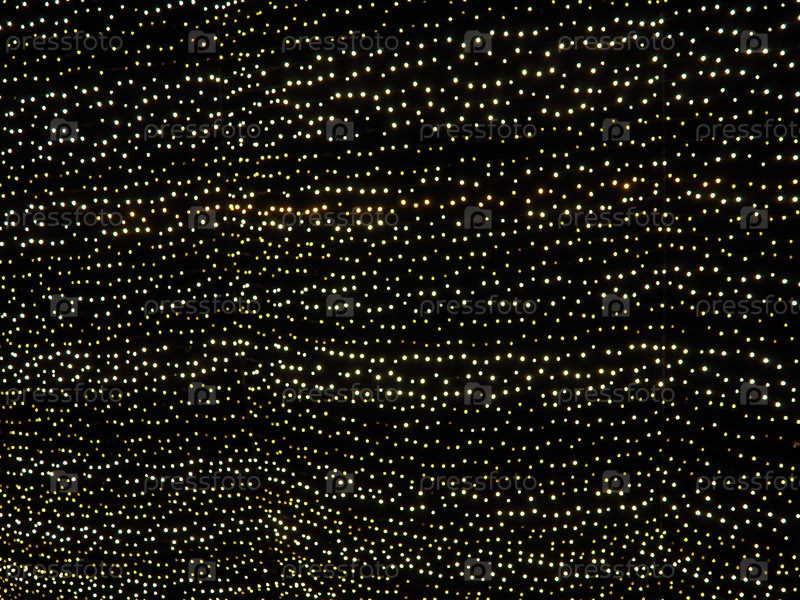 Висящие гирлянды на фоне ночного неба. Праздничное оформление улиц города. Гирлянды из желтых, белых и золотых лампочек и лампочек. Красивый фон для Нового года, Рождества