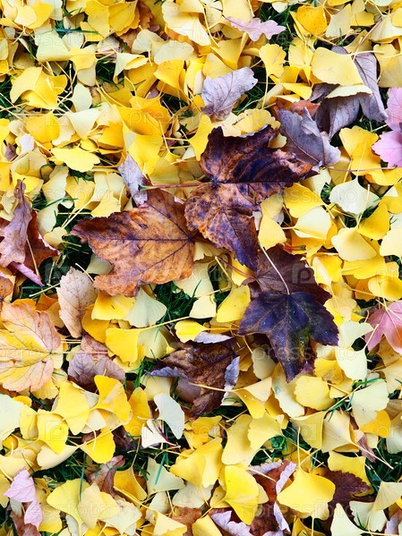 Листья гинкго билоба и кленовые листья лежат на земле. Желтая, коричневая и бордовая листва. Гинкго и клен. Осень в городском парке или лесу. Красочный фон на тему бабьего лета