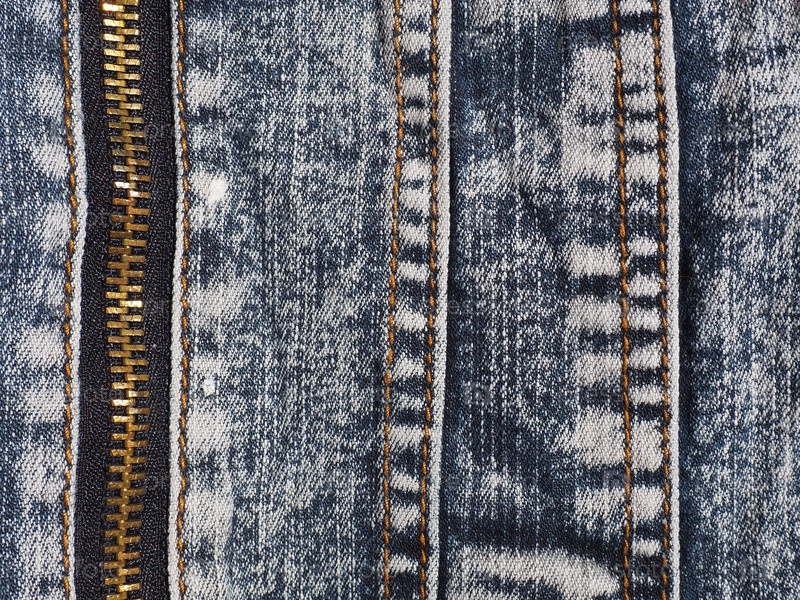 Джинсовая ткань крупным планом со швами и замками. Сильно потертые джинсы. Металлический замок бронзового желтого цвета с бегунком. Вертикальные швы