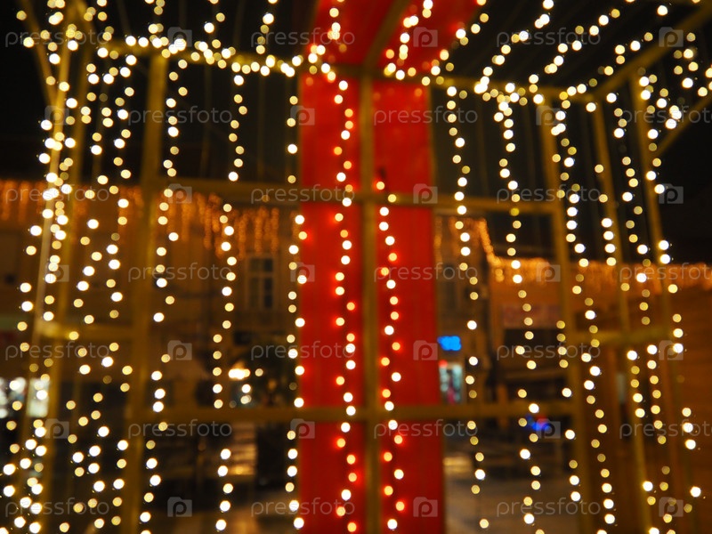 Красивые гирлянды украшают центр города. Уличные украшения к Новому году и Рождеству. Светящиеся многочисленные желтые и белые лампочки в темноте. Разноцветный декоративный дизайн и боке