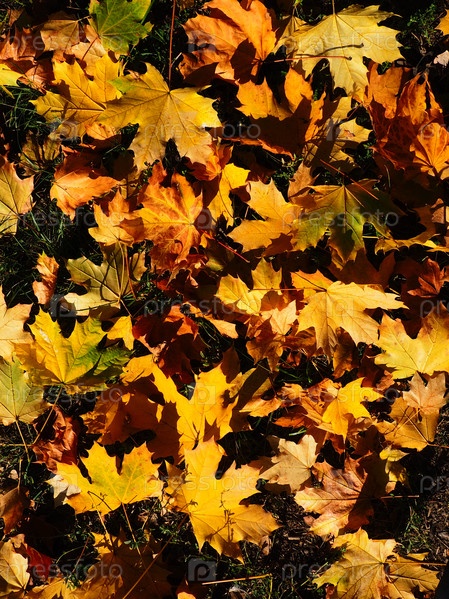 Кленовые листья фон. Бабье лето – период не по сезону теплой и сухой погоды. Много красивых красочных опавших листьев клена лежат на траве. Желтая, красная, оранжевая, зеленая текстура листьев