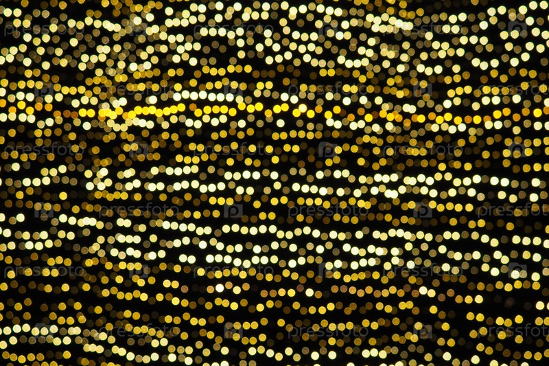 Боке подчеркивает. Золотисто-желтый цвет мигает в темноте. Праздничный фон. Размытая расфокусировка. Украшение городских улиц. Много желтых шариков. Много желтых, белых и оранжевых кругов