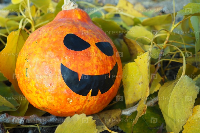Хэллоуинская тыква с черным ртом и наклейками на глаза. Оранжевая овощная тыква лежит на осенних желтых листьях тополя. Тема Хэллоуина или Хэллоуина, канун всех святых или канун всех святых