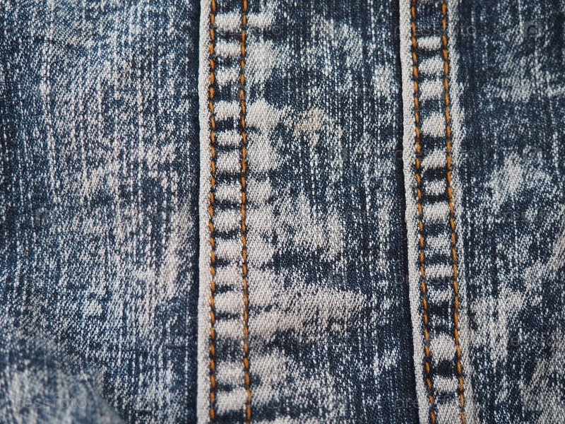 Джинсовая ткань крупным планом со швами и замками. Сильно потертые джинсы. Металлический замок бронзового желтого цвета с бегунком. Вертикальные швы