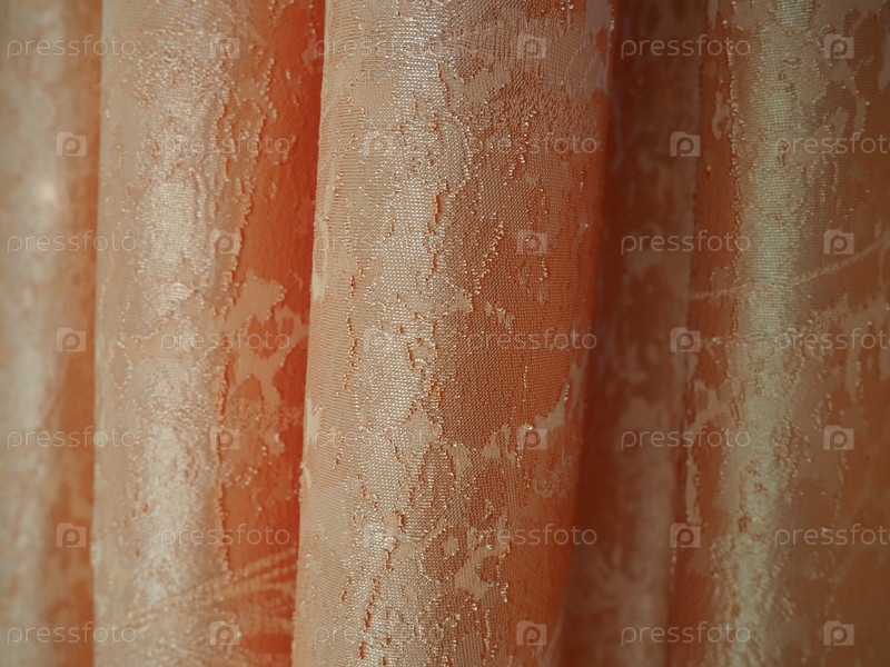 Полиэстеровые шторы крупным планом. Оранжевая набивная плотная ткань для внутренней отделки помещений, пошива штор, одежды, для обивки мягкой мебели. Блестящая ткань с текстурой