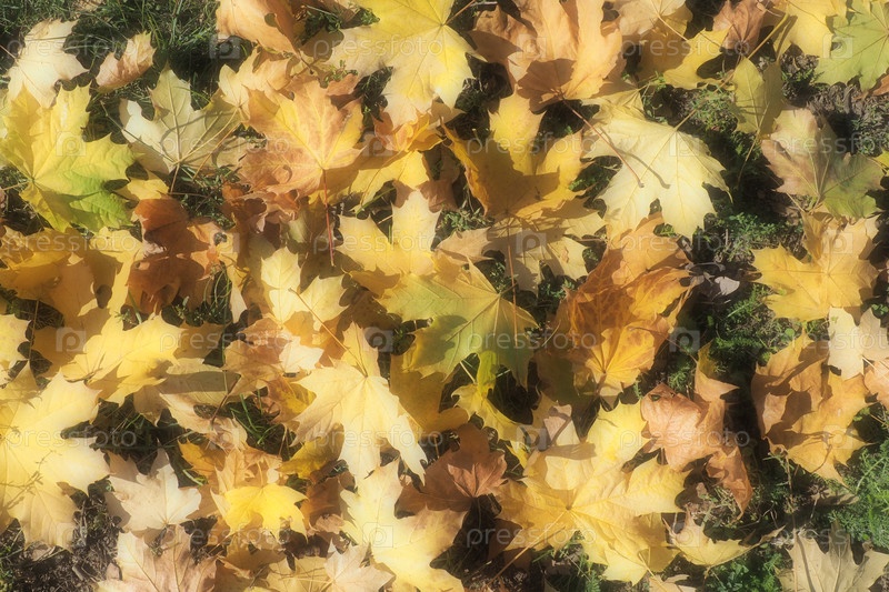 Кленовые листья фон. Бабье лето – период не по сезону теплой и сухой погоды. Много красивых красочных опавших листьев клена лежат на траве. Желтая, красная, оранжевая, зеленая текстура листьев