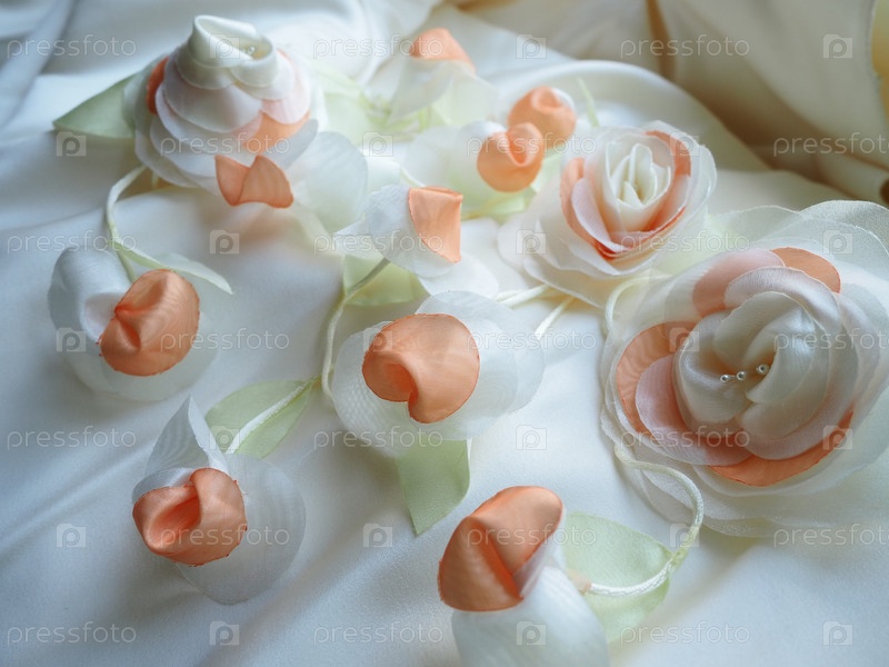 Свадебные цветы из ткани для украшения свадебного платья невесты. Винтажный стиль, размытое туманное изображение. Несколько искусственных цветов и бутонов из шелка. Свадебные украшения для церемонии