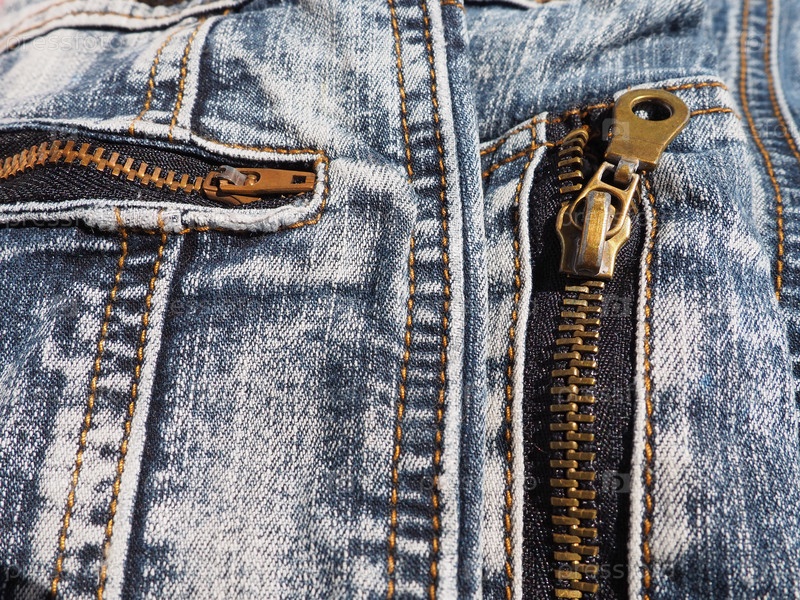 Джинсовая ткань крупным планом со швами и замками. Сильно потертые джинсы. Металлический замок бронзового желтого цвета с бегунком. Карман на джинсах