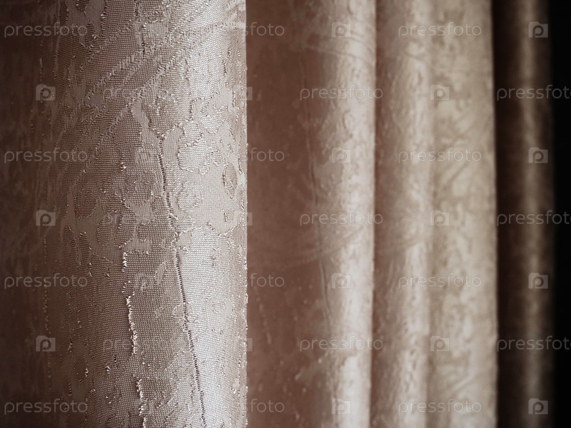 Полиэстеровые шторы крупным планом. Оранжевая набивная плотная ткань для внутренней отделки помещений, пошива штор, одежды, для обивки мягкой мебели. Блестящая ткань с текстурой