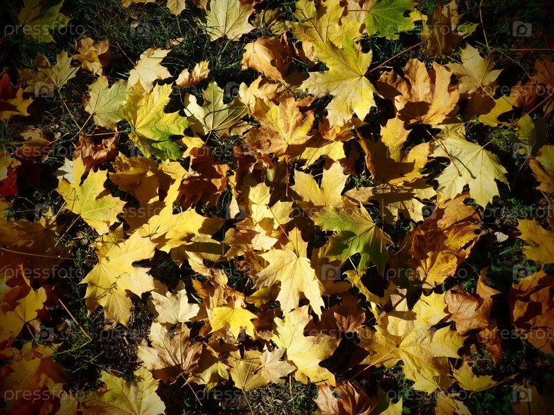 Кленовые листья фон. Бабье лето – период не по сезону теплой и сухой погоды. Много красивых красочных опавших листьев клена лежат на траве. Желтая, красная, оранжевая, зеленая текстура листьев